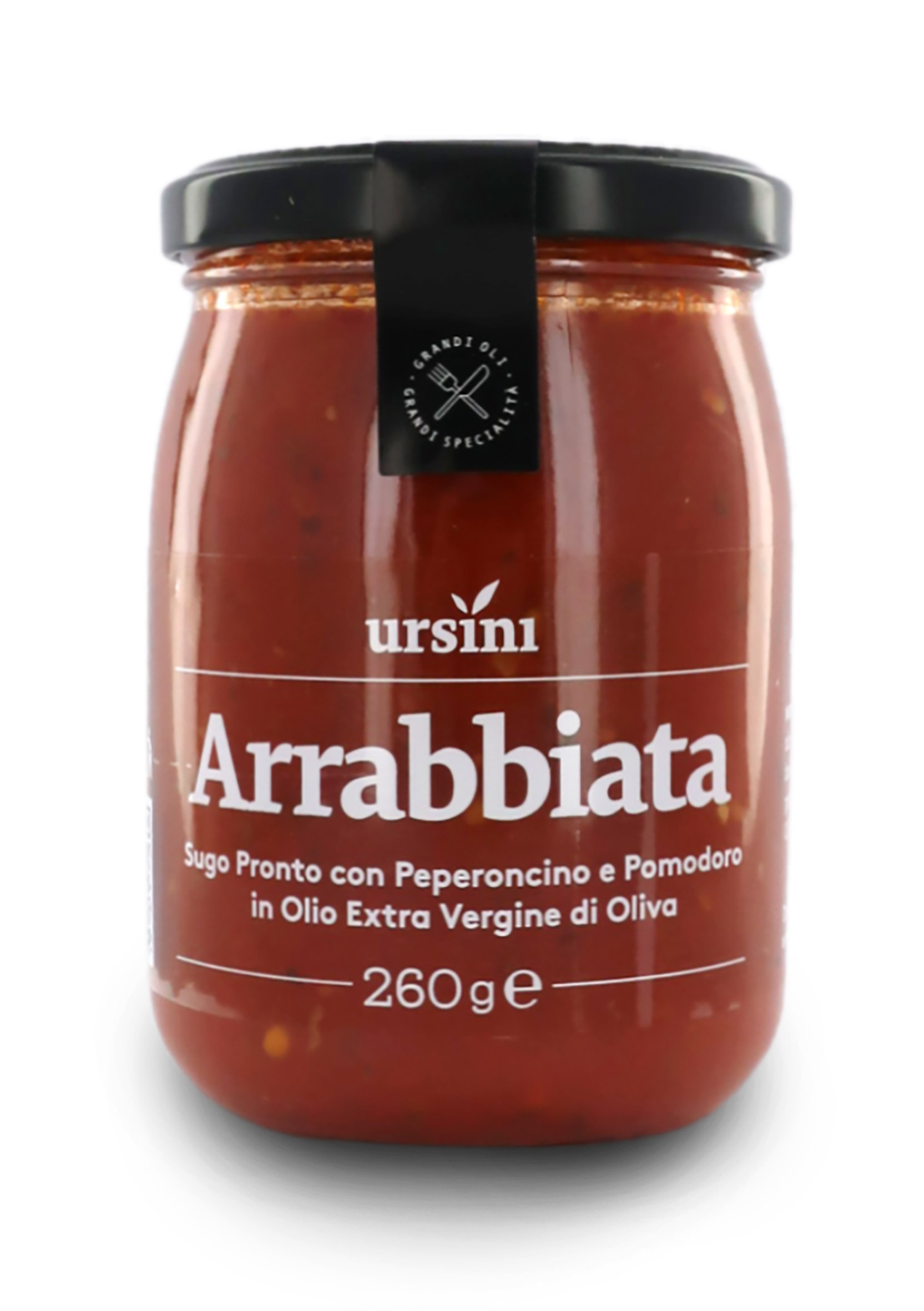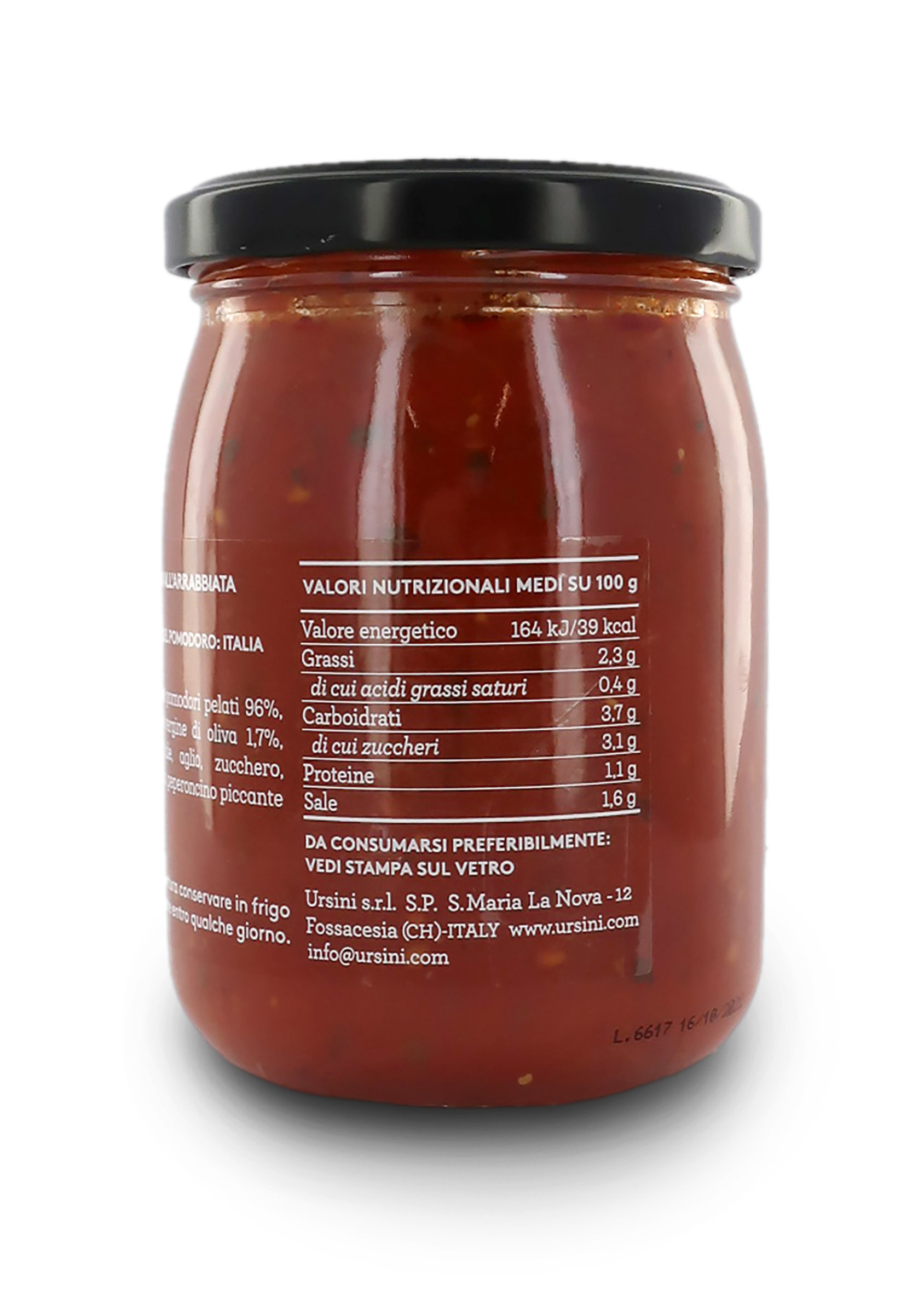 Sugo al gusto classico "arrabbiata", pronto da scaldare e da consumare. Basta scaldarlo per 2/3 min. Contiene pomodoro pelato e olio extravergine di oliva, ed è insaporito con basilico, sale, aglio, prezzemolo e peperoncino. La semplicità e la genuinità del gusto del pomodoro, rallegrate dalla piccantezza del peperoncino, sono protagoniste in questo sugo, condimento tra i più amati della tradizione culinaria italiana.