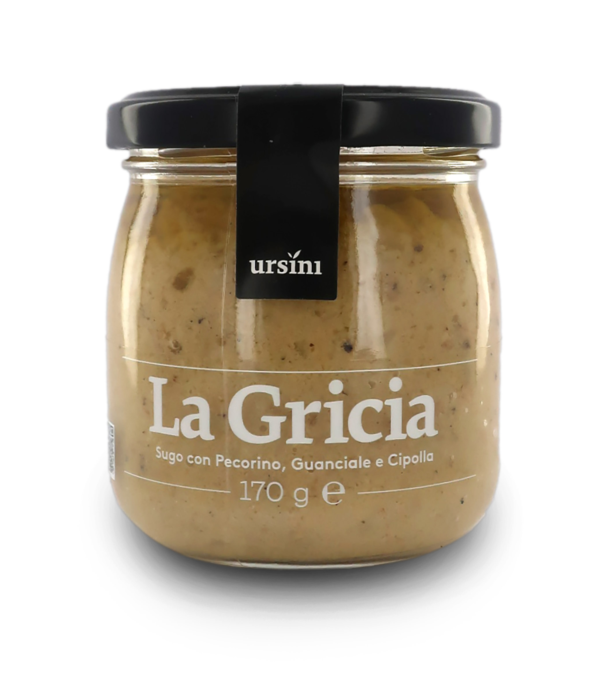 La Gricia è conosciuta anche come la "versione bianca" dell'amatissima amatriciana. In realtà, ne è precorritrice, essendo già in uso prima della diffusione del pomodoro in Italia, avvenuta nel 16esimo secolo. Ricca di gusto, grazie al guanciale sapientemente stagionato, al pecorino di grande qualità, all'aglio, alla cipolla bianca e a una manciata di spezie. Il tutto è legato dal pregiato olio extra vergine di oliva Ursini.