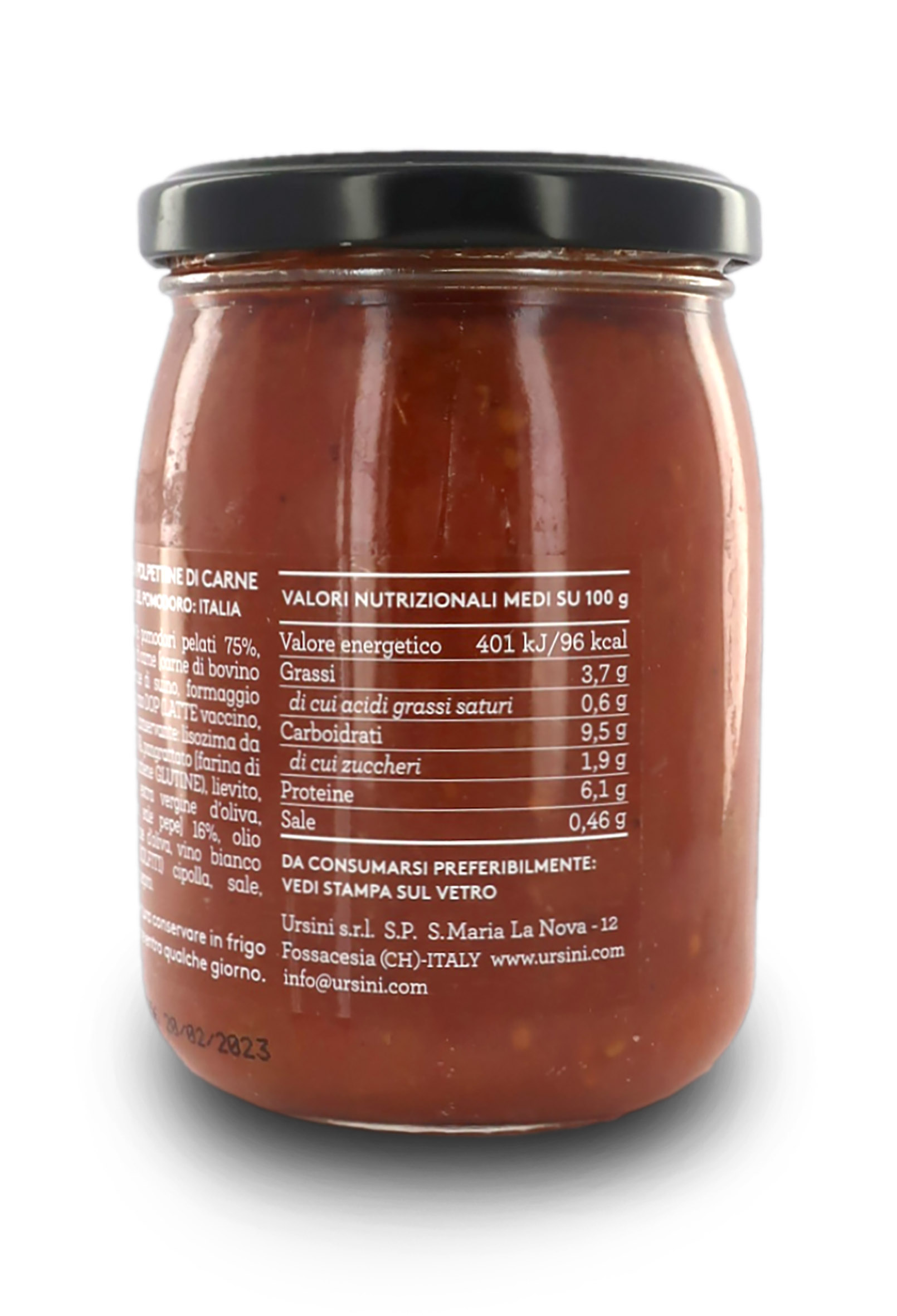 Ingredienti: pomodori pelati 75%, polpettine di carne [carne di bovino adulto, carne di suino, formaggio Grana Padano DOP (latte vaccino, sale, caglio, conservante: lisozima da uova), uova, pangrattato (farina di frumento che contiene glutine, lievito di birra, sale), olio extra vergine di oliva, prezzemolo, sale, pepe] 16%, olio extravergine di oliva, vino bianco (contiene solfiti), cipolla, sale, pimento, ginepro.