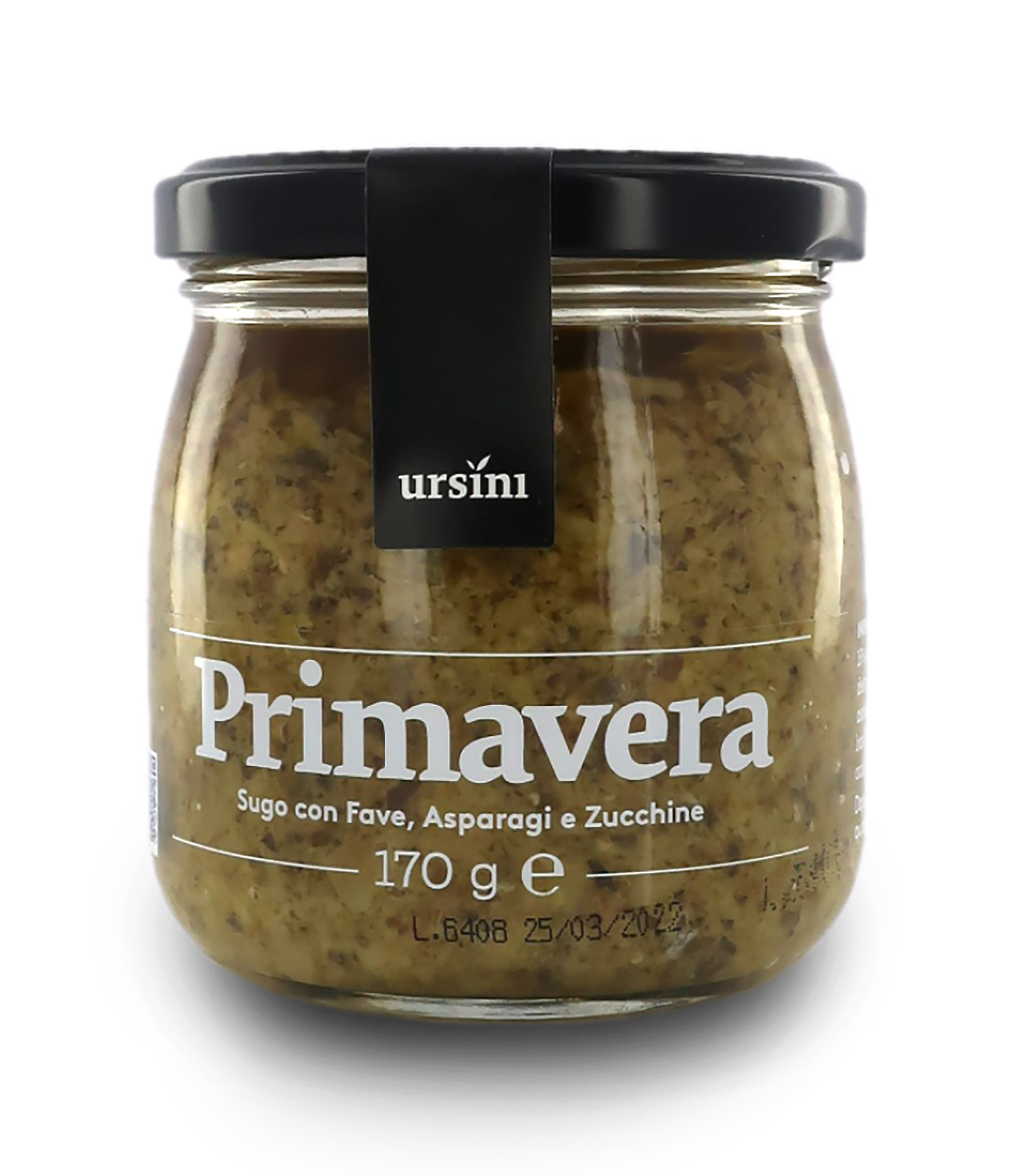 Sugo pronto realizzato con pancetta affumicata e verdure, tra cui fave, asparagi, carciofi e zucchine. Il tutto, sapientemente aromatizzato con prezzemolo, basilico, vino bianco e cipolla, è legato dall'olio extravergine Ursini di grande qualità. Questo condimento è consigliato con rigatoni e mezze maniche.