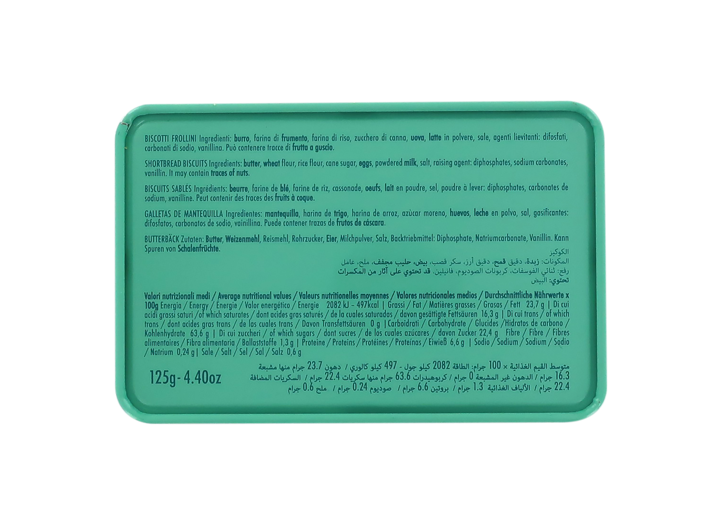 I biscotti frollini Cipriani sono contenuti in una bellissima scatolina di latta rettangolare, nei colori iconici del brand Cipriani. La scatola, una volta terminati i biscotti, può essere comodamente utilizzata come piccolo contenitore.