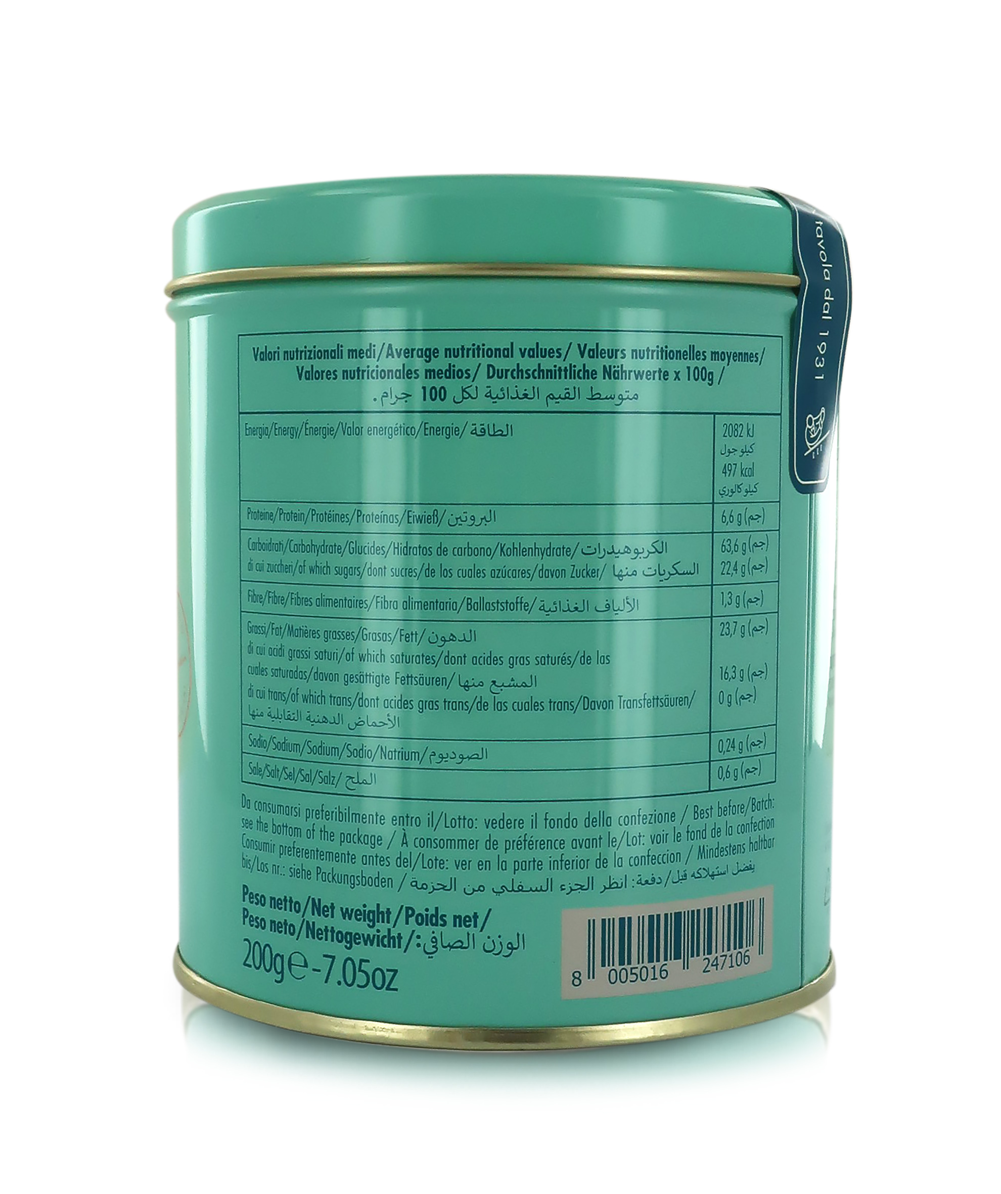 I biscotti frollini Cipriani sono contenuti in una bellissima scatola di latta cilindrica, nei colori iconici del brand Cipriani. La scatola, una volta terminata, può essere comodamente utilizzata come biscottiera o contenitore multiuso.