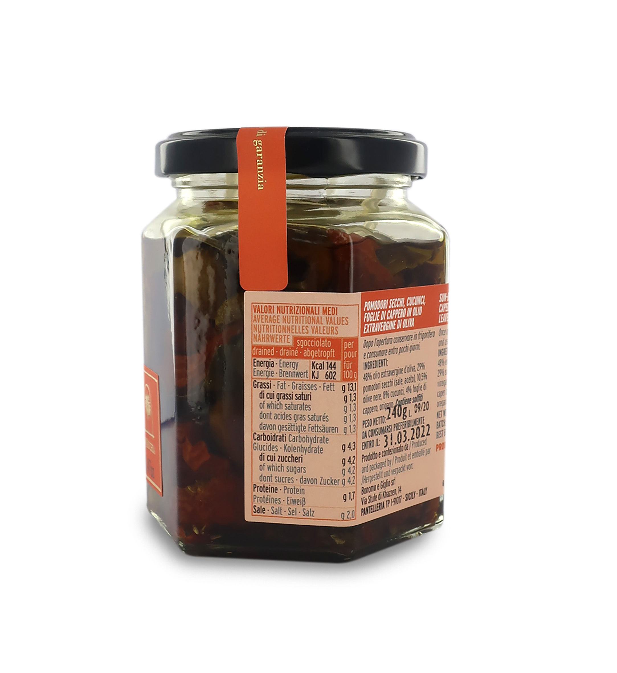 Ingredienti: 48% olio extravergine d’oliva, 29% pomodori secchi (sale, aceto), 10,5% olive nere, 8% cucunci, 4% foglie di cappero, origano. Allergeni: contiene solfiti.