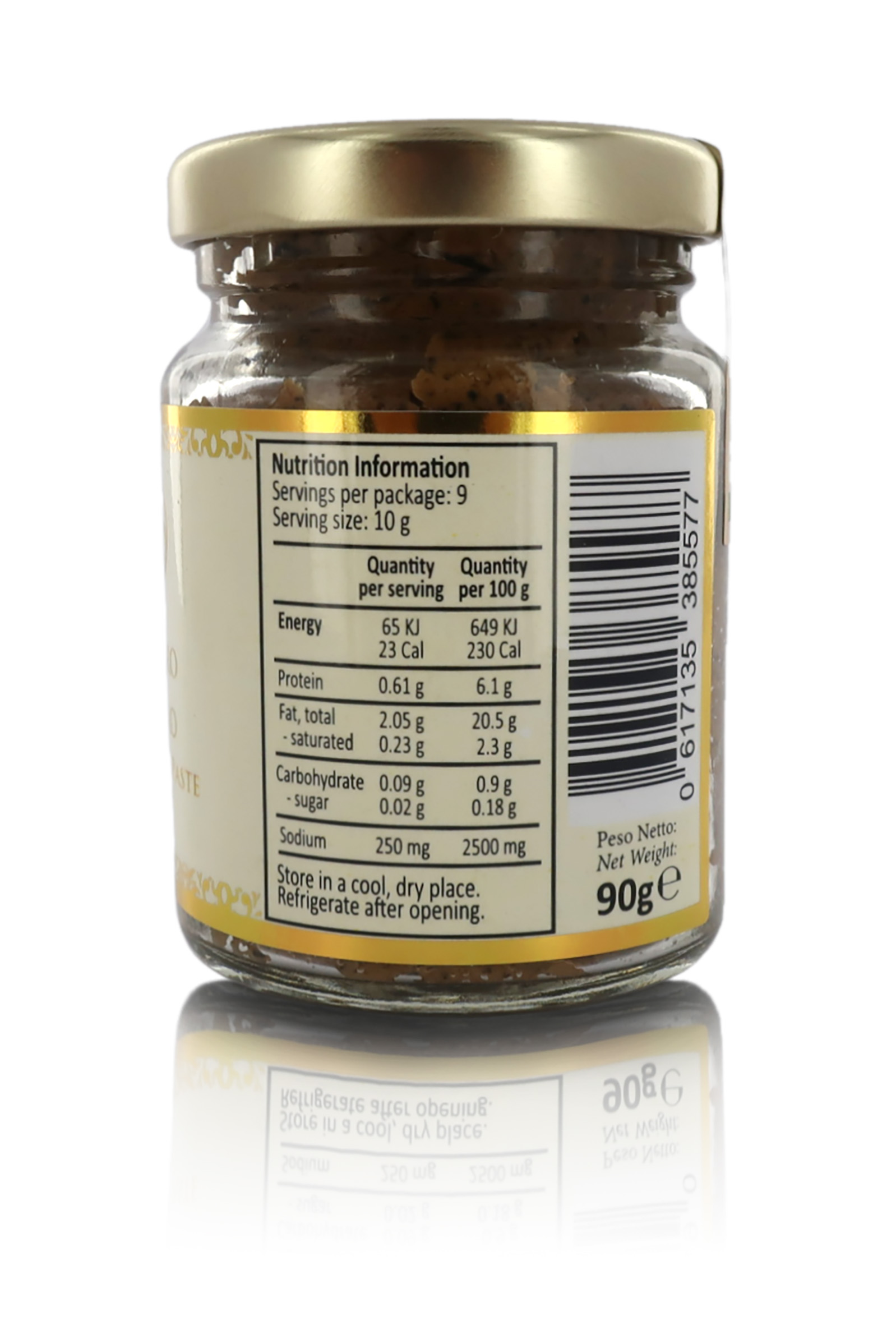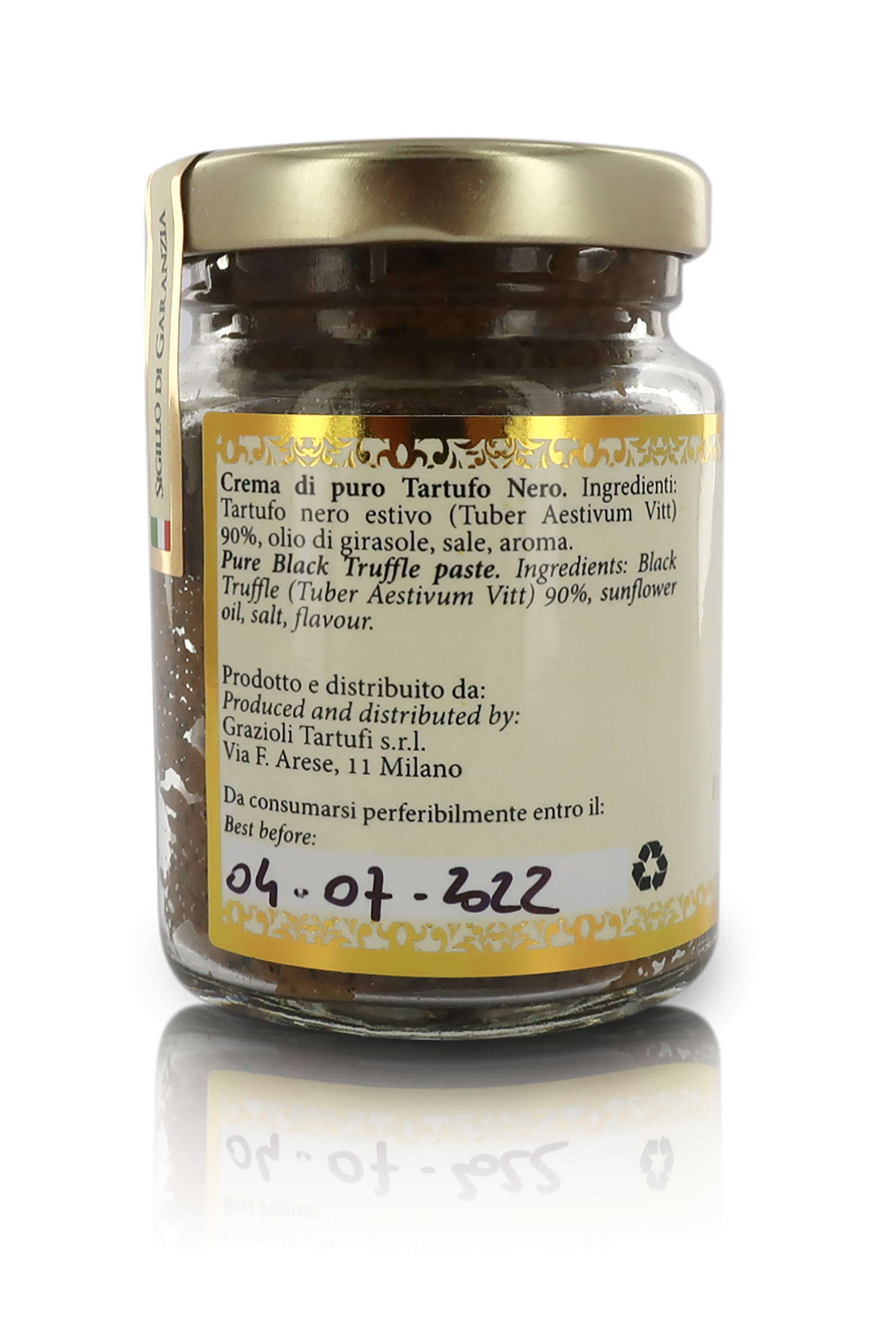 Ingredienti: tartufo nero estivo (Tuber Aestivum Vitt) 90%, olio di girasole, sale, aroma.