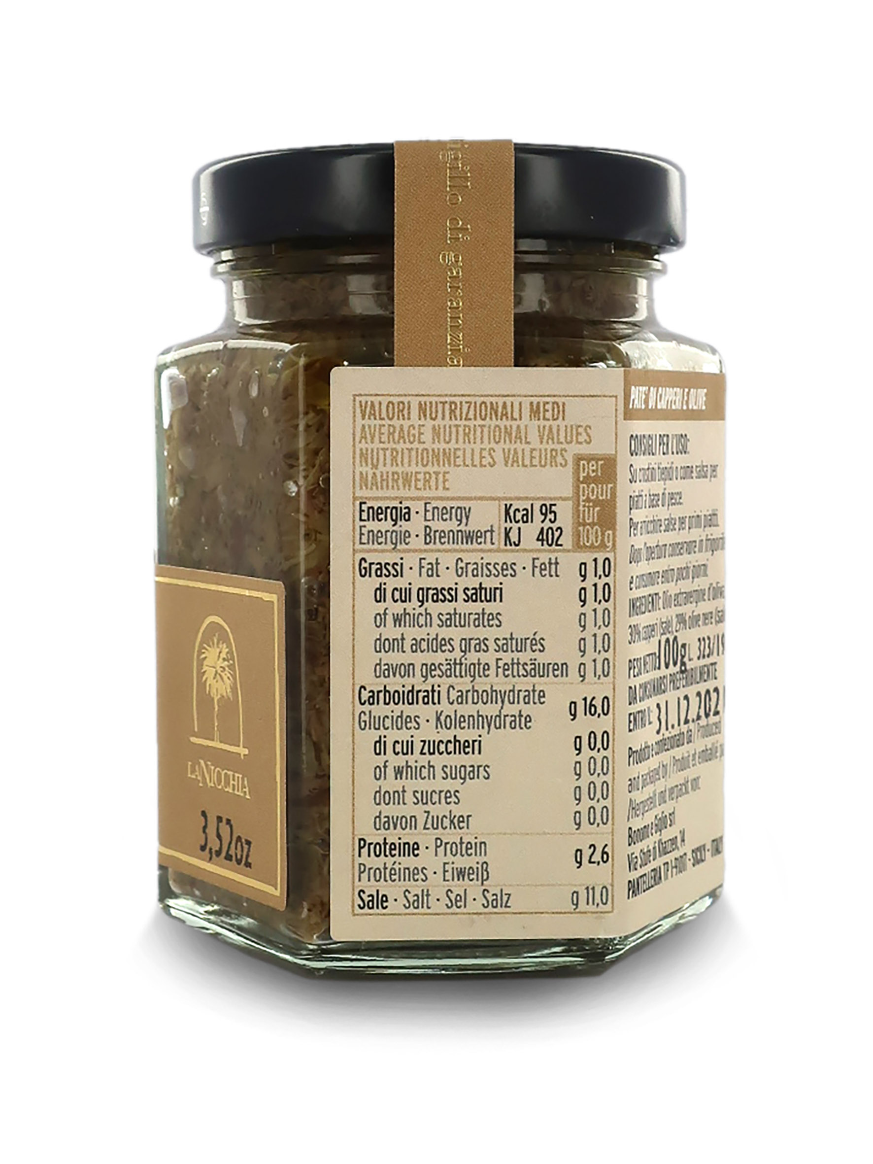 Ingredienti: olio extravergine d’oliva, 30% capperi (sale), 29% olive nere.