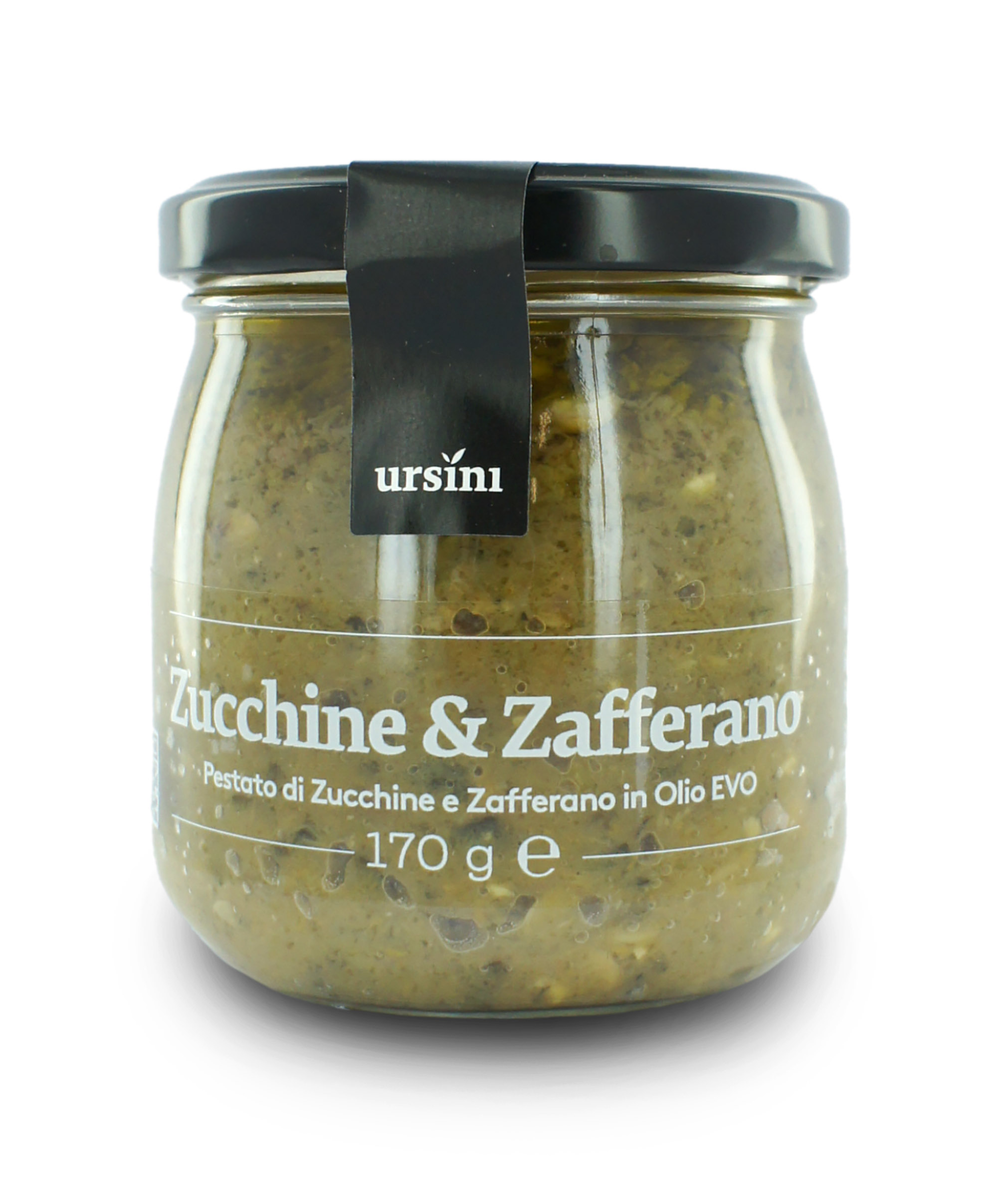 Pestato di zucchine aromatizzato con zafferano, in olio extravergine d'oliva (vasetto da 170g). Ottimo da spalmare su tartine o bruschette, renderà la vostra farcitura per panini gourmet ancora più saporita. Indicato anche come condimento per ravvivare una pasta in bianco.
