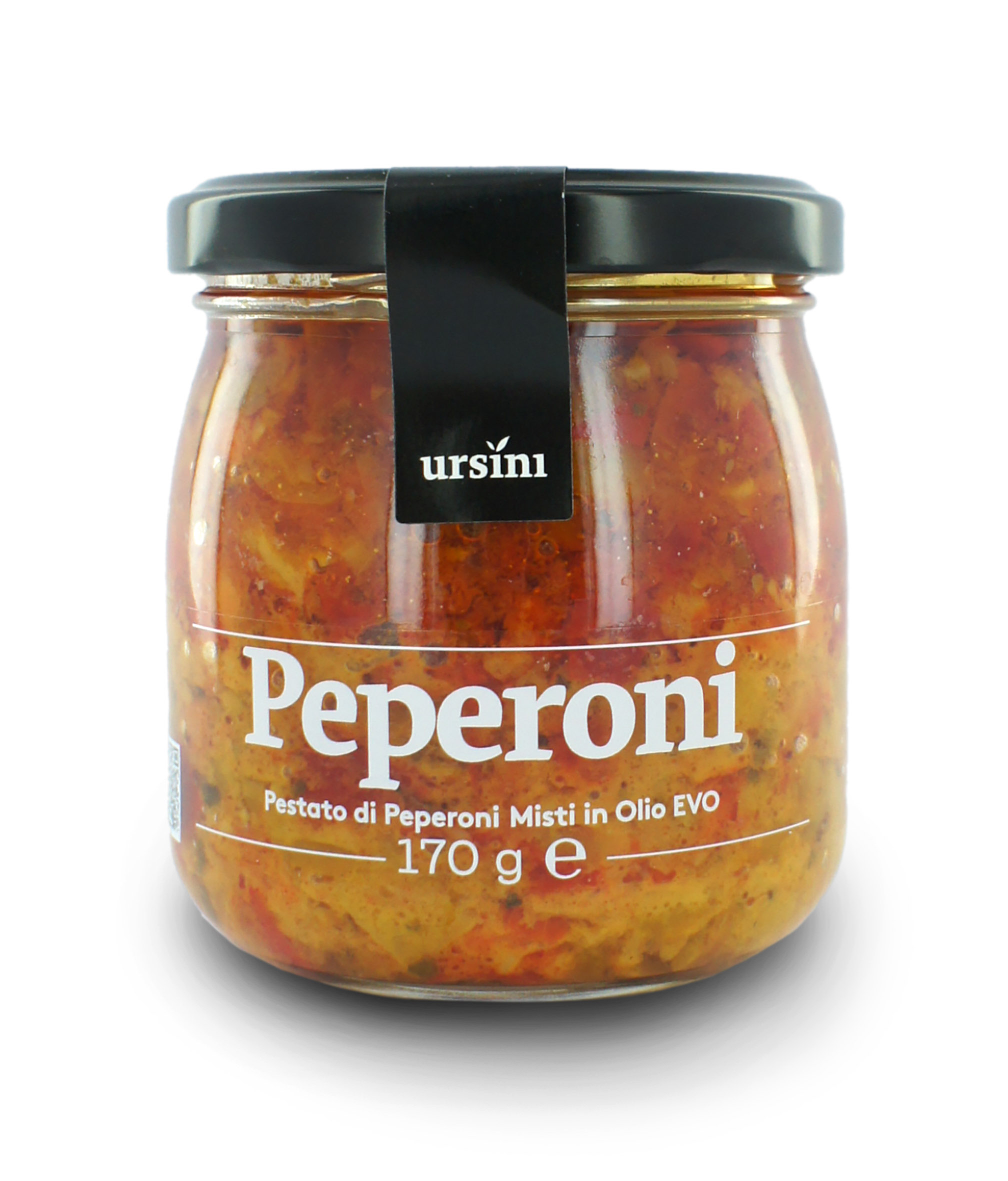 Pestato di peperoni misti in olio extravergine d'oliva. Questa preparazione, realizzata con una base di peperoni di vari colori finemente sminuzzati, è piacevolmente insaporita da ingredienti fortemente aromatici e dal gusto deciso, come alici e varie spezie. In vasetto da 170g. Ottimo da spalmare su tartine o bruschette, renderà la vostra farcitura per panini gourmet ancora più saporita. Indicato anche come condimento per ravvivare una pasta in bianco o dei secondi di carne.