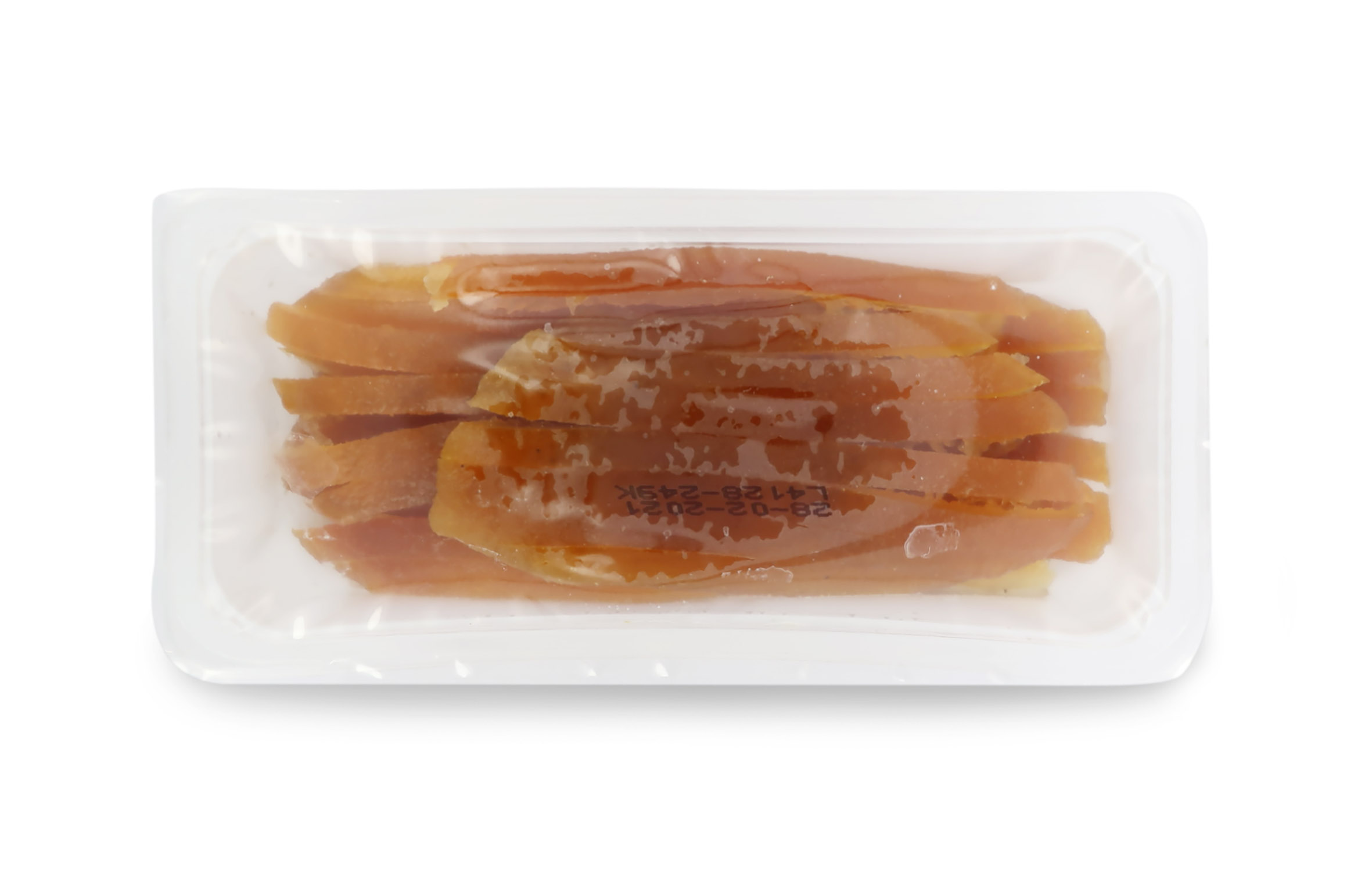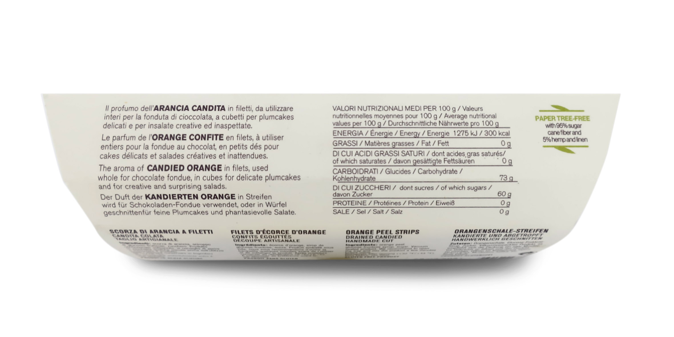 Scorze d'arancia candita in filetti di fattura artigianale, in confezione da 200g. I filetti di scorza d'arancia candita sono contenuti in una pratica vaschetta sotto vuoto, leggermente pastorizzata, appositamente sviluppata per preservare i sapori e i profumi della canditura.