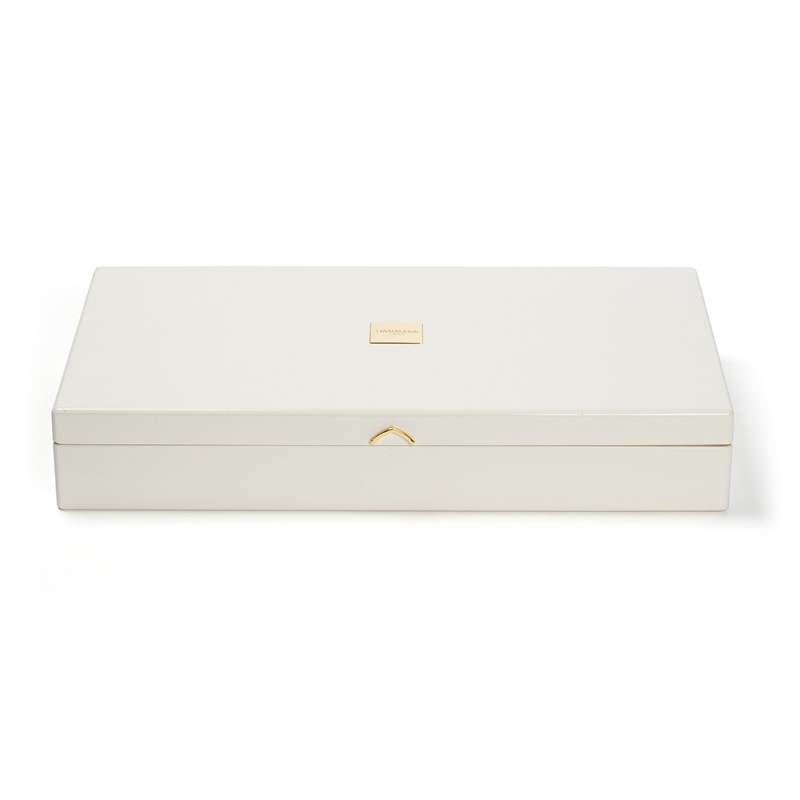 Questo scrigno per tè pregiato Dammann Frères vanta rifiniture di grande qualità. L'esterno è in legno laccato di un raffinato color avorio, mentre l'interno, invece, è di un bellissimo color legno naturale. Il coperchio è abbellito da una placchetta d'ottone.